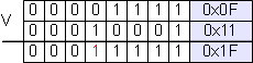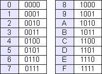 Im Hexadezimalsystem gibt es nicht nur die Ziffern 0 und 1 wie im binären System oder 0 bis 9 gemäß dem Dezimalsystem, sondern stattdessen 0 bis F. Eine Hexadezimalzahl besteht aus vier Bits. Die Abbildung auf der rechten Seite veranschaulicht die Binärzahlen und deren zugehörige Hexadezimalwerte. Binärzahlen werden in Hexadezimalzahlen umgewandelt indem vier Bits zugleich, beginnend bei dem niedrigsten, gelesen werden. Die Bitfolge wird von links nach rechts gelesen und startet bei 0. So ist zum Beispiel das niederwertigste Bit (an Stelle 0) 0 und das mit dem höchsten Wert (an Stelle 3) 1. Im vorangehenden Beispiel ist der Binärwert der Registers 01100001, der im Hexadezimalsystem 61 entspricht und in C als 0x61 (leading zero) geschrieben wird.