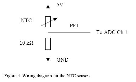 Bei dem in dieser Übung eingesetzten Temperatur Sensor, handelt es sich um einen RH-16 NTC (negative temperature coefficient) von Mitsubishi. Dies bedeutet, dass sich mit steigender Temperatur der Widerstand verringert. Der Widerstand kann über folgende Formel (Nr. 1 im Datenblatt) genähert werden: