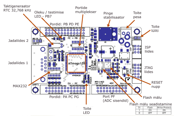 Sämtliche ATmega128 Signale sind an drei Anschlüssen am Rand der Platine verfügbar. Die Anschluss-Pin Verteilung wird im folgenden Abschnitt dieser Anleitung beschrieben. Der Abschnitt enthält eine vollständige Beschreibung der Pins des ATmega128 sowie deren alternativer Funktionen. Das Modul ist mit einem Mikropozessor-Resetschaltkreis ausgestattet (wenn es an die Stromzufuhr angeschlossen ist) sowie einem Resetschalter für den Neustart des Mikroprozessors. Der Mikroprozessor kann mit ISP oder JTAG programmiert werden.