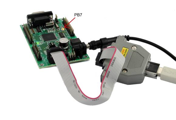Am siebten Pin von Port B (PB7) ist eine Status-LED (mit PB7 auf der Platine gekennzeichnet) angeschlossen. Diese LED kann als Statusindikator für Software genutzt werden. Eine niedrige Spannung an PB7 sorgt dafür, dass die LED leuchtet.
