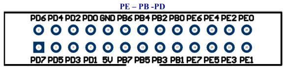• Sämtliche ATmega Signale sind an drei Anschlüssen verfügbar (1. D, B, E Anschlüsse, 2. G, C, A Anschlüsse, 3. F Anschluss mit ADC I/O Kanälen)