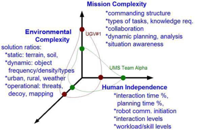 Besides a plain autonomy level definition, several models have been proposed for assessing UMS (Unmanned Systems) level of autonomy and autonomous performance, and these models are briefly discussed in this section. Among the earliest attempt to quantify autonomy is 1) work on autonomy model ALFUS. The ALFUS is not a specific test or metric, but rather a model of how several different test metrics could be combined to generate an autonomy level. As it is depicted below ALFUS model uses three dimensions – Environmental complexity, Mission Complexity, and Human independence describe – are used to assess the autonomy of a given UMS 2).