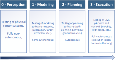 Partially ALFUS drawbacks are tackled by another – non-contextual assessment formally called the Non-Contextual Autonomy Potential (NCAP) 4). The NCAP provides a predictive measure of a UMS’s ability to perform autonomously rather than a retrospective assessment of UMS autonomous performance relaying on tests performed before the actual application of the system being assessed. The NCAP treats autonomy level and autonomous performance separately. A UMS that fails completely at its mission but does so autonomously still operates at the same autonomy level as another UMS that succeeds at the same mission. Model visualization is provided below: