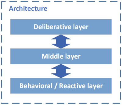 Hybrid architectures combine the best of both deliberative and reactive (behavioural) architectures. However, the so-called – three-layer architecture is the most known one and combines reactive control at the lowest level and deliberative layer at the top level of the architecture: