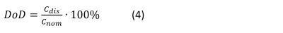 During battery operation there are two similar but opposite variables which indicate how much charge is left in the battery: depth-of-discharge (DoD) and state-of-charge (SoC). Both of variables are relative indicators and are expresses in percent. As the name suggests DoD indicates how much charge is left in battery in respect to a fully charged battery. A 0% DoD level means that the battery is fully charged while 100% DoD level means that a battery has been fully discharged. DoD can be calculated using (x) where Cdis is discharged capacity and Cnom is the nominal capacity. The SoC is an inverse of DoD: it indicates how much charge is remaining in the battery. A fully charged battery is at 100% SoC while 0% SoC means that the battery is completely discharged. DoD indicator has the benefit to go over 100% - it can happen in situations when a low discharge rate is used and thus battery can deliver more charge than nominal. The SoC indicator in this case would go negative which can cause confusion. In practical use, the SoC is mostly used as indicator to describe the remaining charge of a battery in operation, in essence, it is a fuel gauge indicator. Rarely DoD is expressed not in percentage points but in discharged amp hours (Ah) as shown in expression (x). In this case the user must know the nominal capacity to make sense of the DoD reading.