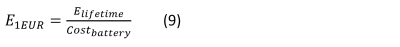 For example, a small 300Wh battery costs 150€. Its nominal cycle life is 500 cycles which results in 150000Wh or 150kWh of total discharged energy throughout its lifetime. If this number is divided by the price, then a 1kWh/1€ figure is obtained. It shows that each single euro was converted to 1kWh of discharged energy throughout batteries lifetime. This performance indicator can be used to compare different battery technologies and individual cells which have different cycle life parameters.