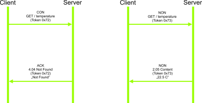 Request-reponse pair is identified by a unique “Token”. Sample request-response scenarios are presented in images below. Sample CoAP message exchange scenarios between client and server are presented (two per image) in Figure 382 and Figure 383.
