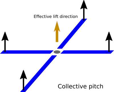 A regular helicopter has a large rotor with at least two blades. Each blade can be rotated parallel to its length, this way changing the lift force generated by each blade. Moreover, each blade can be virtually rotated independently; thus, the main rotor can “vector” the lift, enabling the helicopter to roll and pitch.