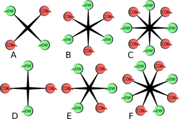 In Figure 15 there are presented variants for quad-, hex- and octocopters, where their geometry differs. In general, X-shaped constructions (A, E, F) are more popular than plus-shaped ones(B, C, D), because of two major factors: