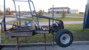 Electric buggy for educational use in vocational schools for automotive students. Possible to use track days in cross country tracks or in winter time when slippery. It is main design purpose is to be a platfrom for studying electric vehicle technology. Buggy type of vehicle is best for that purpose because all the parts and systems are visible through the frame construction. It is made so that there would be minimal risks of electric shock. Low voltage design 60V. To get reasonable power, very high current controller is used. Battery is mounted similiarly as usual road EV-s it is possible to practice EV service with smaller and lighter battery pack then on real electric cars. Battery, weight about 80kg. Nowadays some cars have already 500kg battery pack that can be dangerous to lift by students. Here you have to take into account of the price of real battery if something goes wrong. Also it is not very easy to guarantee safety of the stundents near 400V battery pack. Workshop regulations even do not allow unqualified people near real EV when high voltage systems opened.