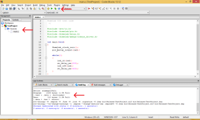 Once the project is created, then the new project appears in the left tree with example code. To compile press the gear icon in the toolbar. If the compilation succeeds then in the bottom Build Log window the user program memory count are displayed or if not, then error messages in the event of failure.