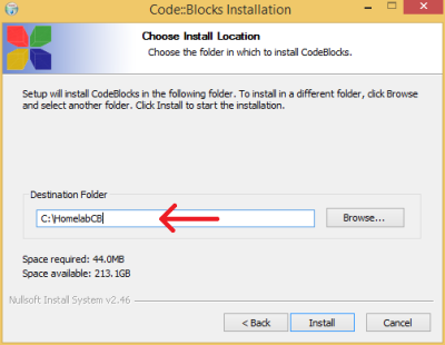 Next choose correct location for CodeBlocks. All examples are in default location C:\HomelabCB Then CodeBlocks software install on the computers.
