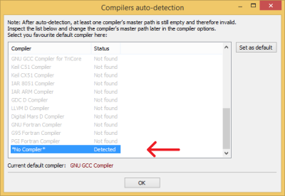 The first launch prompted compiler location. May be select *No Compiler*, because the choice of the compiler is set manually at a later, and it is dependent to the project template.