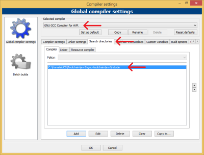 Then, the compiler should be set. Enter the menu Settings → Compiler…. In the opened window should be set to the following lines: Observe that would be selected GNU GCC Compiler for AVR and show where to install the software. If the installed sowtware location is not C:\HomelabCB then should be made corresponding changes themselves.