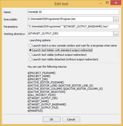 • “C:\HomelabCB\Programmer” “${TARGET_OUTPUT_BASENAME}.hex”