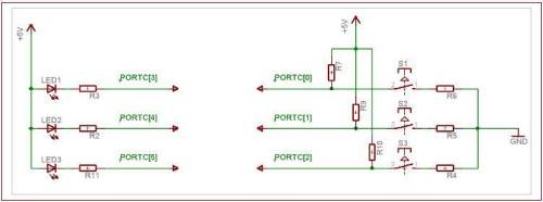 3 Light Emitting Diodes (LED), connected to port PORTC[3..5];