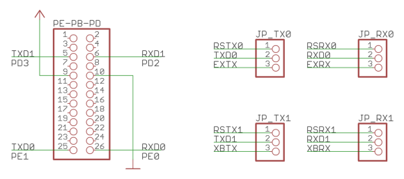 The communication board is connected with the controller module to the port PE-PB-PD. With a jumper it is possible to select which external connector is routed to the microcontroller UART ports.
