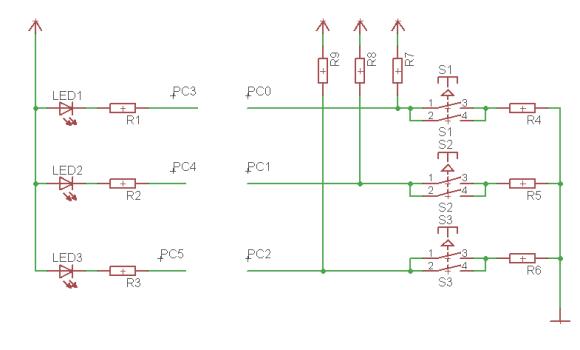 User interface module is equipped with three buttons S1, S2, S3 which are connected to ports PC0, PC1, PC2 accordingly. The other end of buttons are connected through the resistors to ground (logical 0). LED1, LED2 and LED3 on the module are connected to the ports PC3, PC4, PC5 accordingly. The anodes of LEDs are connected to the supply (logical 1).