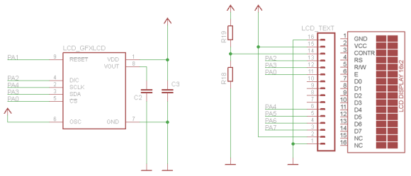 The graphical LCD display on the module is connected to port PA. In parallel the same port has external connector where all pins are aligned according to the standard 2 x 16 alphanumeric LCD 4 bit control. The user can choose whether to use the graphical or alphanumeric LCD. It is not possible to use both at the same time. The graphical LCD's background lighting can be logically controlled by the software. The back-light intensity of the alphanumeric LCD is regulated with on-board resistor and graphical LCD back-light can be controlled by the software. Both LCD displays are connected to port PA but only one at a time can be used. When selecting the alphanumeric LCD the jumper should be removed to avoid random control of graphical LCD background light.