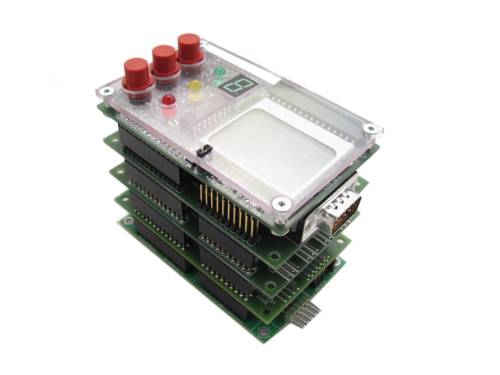 User interface module is designed for simple tasks and basic process control. Module has three push-buttons and three LEDs, which can be used as digital inputs and outputs of microcontroller. Additionally to simple LEDs the module is equipped with 7-segment indicator, graphical LCD display and alphanumeric LCD outputs. User interface module is handy to use along with other modules enabling to control the output device behavior, like motors and display the sensor readings. The module is covered with plexiglass to protect the board from accidents.