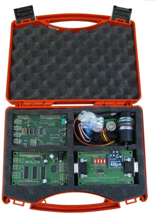 The modules of the Robotic HomeLab are divided into different kits, allowing one to select the best option for the needs of a student or school. The simplest set is the Robotic HomeLab Basic kit including the components to carry out the basic microcontroller experiment. In addition to the microcontroller, the kit consists of a User Inteface module with LCD display. Together with the Robotic HomeLab Basic kit, the Robotic HomeLab Add-On kit can be used; this includes different types of motors and sensors together with accessories and Communication module. The Robotic HomeLab Add-On kit cannot be used separately from the Robotic HomeLab Basic kit as the microcontroller is not included in the Add-On kit. In addition the RFID and Machine Vision modules are available. The Robotic HomeLab Basic kit together with the Robotic HomeLab Add-On kit are convenient to use and carry to home for the robotic experiments.