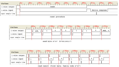 In any MicroLAN, there is always one master in overall charge, which may be a PC or a microcontroller. The master initiates activity on the bus, simplifying the avoidance of collisions on the bus. Protocols are built into the software to detect collisions. After a collision, the master retries the required communication. Many devices can share the same bus. Each device on the bus has a unique 64-bit serial number. The least significant byte of the serial number is an 8-bit number that tells the type of the device. The most significant byte is a standard (for the 1-wire bus) 8-bit CRC. There are several standard broadcast commands, as well as commands used to address a particular device. The master can send a selection command, then the address of a particular device. The next command is executed only by the addressed device. The 1-wire bus enumeration protocol (described later), like other singulation protocols, is an algorithm the master uses to read the address of every device on the bus. Since the address includes the device type and a CRC, recovering the address roster also produces a reliable inventory of the devices on the bus. The 64-bit address space is searched as a binary tree, allowing up to 75 devices to be found per second. The Dallas 1-Wire network is physically implemented as an open drain master device connected to one or more open drain slaves. A single pull-up resistor is common to all devices and acts to pull the bus up to 3 or 5 volts and may provide power to the slave devices. Communication occurs when a master or slave asserts the bus low, i.e. connects the pull-up resistor to ground through its output MOSFET. Specific 1-Wire driver and bridge chips are also available. Data rates of 16.3 kbit/s can be achieved. There is also an overdrive mode which speeds up the communication by a factor of 10. The master starts a transmission with a reset pulse, which pulls the wire to 0 volts for at least 480 µs. It resets every slave device on the bus. After that, any slave device, if present, shows that it exists with a “presence” pulse: it holds the bus low for at least 60 µs after the master releases the bus. To send a “1”, the bus master sends a very brief (1–15 µs) low pulse. To send a “0”, the master sends a 60 µs low pulse. The falling (negative) edge of the pulse is used to start a monostable multivibrator in the slave device. The multivibrator in the slave clocks to read the data line about 30 µs after the falling edge. The slave's multivibrator unavoidably has analog tolerances that affect its timing accuracy, which is why the “0” pulses have to be 60 µs long, and the “1” pulses can't be longer than 15 µs. When a dedicated 1-Wire interface peripheral is not available, a UART can be used to implement a 1-wire bus master. Serial or USB “bridge” chips are also available that handle the timing and waveform requirements of the 1-Wire bus, and are particularly useful in utilizing long (greater than 100 m) cables effectively. Up to 300 meter long buses consisting of simple twisted pair telephone cable has been tested by the manufacturer. It will, however, require adjustment of pull-up resistances from 5 to 1 kΩ. When receiving data, the master sends a 1–15-µs 0-volt pulse to start each bit. If the transmitting slave unit wants to send a “1”, it does nothing, and the bus goes to the pulled-up voltage. If the transmitting slave wants to send a “0”, it pulls the data line to ground for 60 µs. The basic sequence is a reset pulse followed by an 8-bit command, and then data is sent or received in groups of 8-bits. When a sequence of data is being transferred, errors can be detected with an 8-bit CRC (weak data protection). To find the devices, the master broadcasts an enumeration command, and then an address, “listening” after each bit of an address. If a slave has all the address bits so far, it returns a 0. The master uses this simple behavior to search systematically for valid sequences of address bits. The process is much faster than a brute force search of all possible 64-bit numbers because as soon as an invalid bit is detected, all subsequent address bits are known to be invalid. An enumeration of 10 to 15 devices finishes very quickly. The location of devices on the bus is sometimes significant. For these situations, the manufacturer has a special device that either passes through the bus or switches it off.