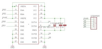 DC motors are connected to the DC group of pins. Every pair of pins can control 1 DC motor, thus it's possible to manipulate 4 DC motors. The combo board uses bd6226fp H-bridge to control DC motors. It's possible to manipulate a device that can be controlled digitally, with a current of less than 1 A and a voltage of no more than 18 V, such as a DC motor with DC pins (e.g., Piezoelectric generator, relay).