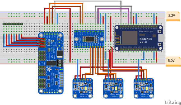 In the system, there are three TCS34725 light sensors. Sensors have the same I2C addresses (0x29h) but are connected to different channels of I2C extender (TCA9548A). I2C extender address is 0x70h.