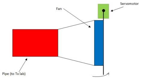 The node is an airflow generator, connected to the appropriate air receiving node. There is an air duct that connects nodes (node 2 send air to node 1, while node 4 send air to node 3). The lab consists of the fan which is a source of airflow going to the air duct. The beam of the airflow can be regulated in two ways: