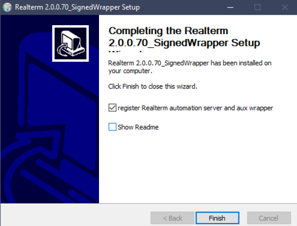 At the end of the installation make sure the “register Realterm automation server and aux wrapper” option is checked.