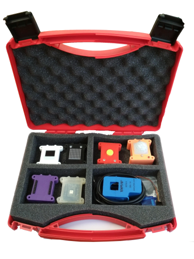 IoT HomeLab Add-On kit consist of 5 shields, one small RC servo motor and a AC current sensor.