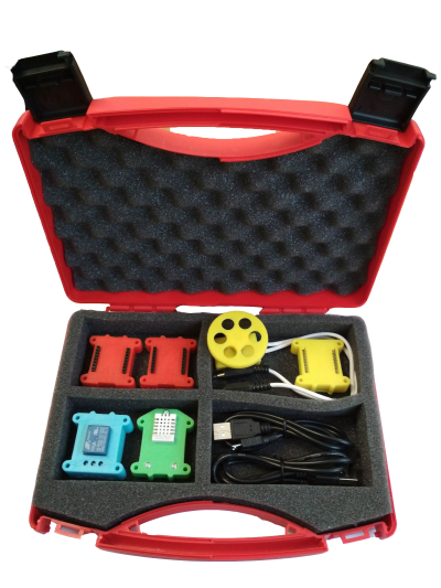 The IoT HomeLab Basic kit consist of two main controllers, 3 shields, encoder/switch and USB cables.