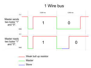 A read-time is initiated by master device pulling the 1-wire bus low for a minimum of 1 µs and then releasing the bus. Slave device transmits a 1 by leaving the bus high and transmits a 0 by pulling the bus low.
