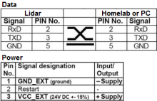 To make the SICK operational, it must be wired for power and communication. On the back of the SICK there are two connectors that looks like serial port connectors. The connector with the female end is for power and the connector with the male end is for communications. The power and the serial cable should be wired as shown in the picture. Lidar can be connected with Robotic HomeLab Communication module using one of the RS-232 connectors. Power must be taken from external power source and this is not included in Robotic HomLab kit. Required dc power voltage is 24 V.