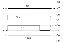 In robotics DC motors are in most cases controlled by microcontrollers and as microcontrollers are digital devices it is much easier to control motor speed also digitally. To do that, instead of keeping transistor open partly, transistors need to be closed and opened constantly using pulse width modulation (PWM), so the total energy supplied to the motor is somewhere between motor switched off and motor running on full power. Opened time in the whole PWM period is called duty cycle, which is marked as percents. 0% means the transistor is closed constantly – it is not conducting current. 100% means the transistor is constantly open and is conducting current all the time. The frequency of the PWM has to be high enough to avoid vibrations in the shaft of the motor. At low frequencies the motor produces noise and due to that, modulation frequencies over 20 kHz are used quite often. On the other hand the efficiency of the transistors might not be so good at higher frequencies. Vibrating of the shaft of the motor is reduced by inertia of the rotor and the inductivity of the coils. Instead of using single transistor, H-bridge can be feed with the same PWM signal by controlling so motor speed and direction.