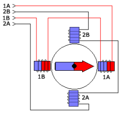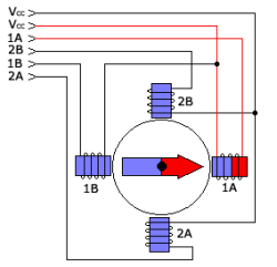 Bipolar stepper motor differs from unipolar stepper motor by having the polarity of the windings altered during the commutation. Half of the windings are activated together, this allows to gain higher efficiency than unipolar stepper motors. Bipolar stepper motors have four leads, each connected to a different half-bridge (driver L293 on the board of motors). During commutation half-bridges are applying either positive or negative voltage to the ends of the windings. Unipolar motors can be started using bipolar driver: just connect lines 1a, 1b, 2a and 2b of the windings (Vcc will be not connected).