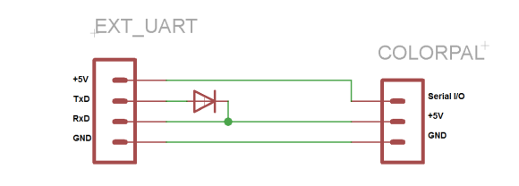 ColorPAL sensor requires only three connections: +5 V supply, ground and serial data. It can be plugged into Robotic Homelab communication board EXT_UART connector. Separate TxD and RxD pins needs to be connected together using diode. Communication with the ColorPAL takes place using serial I/O transmitting and receiving at between 2400 and 7200 baud using a non-inverted open-drain protocol.