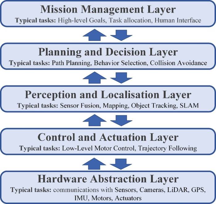 In the subsequent chapters, we will delve deeper into these topics with a framing informed by autonomy abstractions as shown in the figure below. At the “bottom” of these abstractions are the physical objects such as the mechanical devices and the associated electronics hardware. Layered above the electronics hardware layer are various software layers which start with middleware/infrastructure, algorithmic layers, and finally the connection to humans.