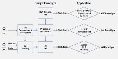As shown in Figure 4, within electronics, there has been a progression of system function construction where the first stage was hardware or pseudo-hardware (FPGA, microcode). The next stage involved the invention of a processor architecture upon which software could imprint system function. Software was a design artifact written by humans in standard languages (C, Python, etc.). The revolutionary aspect of the processor abstraction allowed a shift in function without the need to shift physical assets. However, one needed legions of programmers to build the software. Today, the big breakthrough with Artificial Intelligence (AI) is the ability to build software with the combination of underlying models, data, and metrics. In their basic form, IT systems were not safety critical, and the similar levels of legal liability have not attached to IT products. However, the size and growth of IT is such that problems in large volume consumer products can have catastrophic economic consequences [10]. Thus, the V&V function was very important. IT systems follow the same generic processes for V&V as outlined above, but with two significant differences around the execution paradigm and source of errors. First, unlike the PBE paradigm, the execution paradigm of IT follows a Decision Based Execution mode (DBE). That is, there are no natural constraints on the functional behavior of the underlying model, and no inherent properties of monotonicity. Thus, the whole massive ODD space must be explored which makes the job of generating tests and demonstrating coverage extremely difficult. To counter this difficulty, a series of processes have been developed to build a more robust V&V structure. These include: 1) Code Coverage: Here, the structural specification of the virtual model is used as a constraint to help drive the test generation process. This is done with software or hardware (RTL code). 2) Structured Testing: A process of component, subsection, and integration testing has been developed to minimize propagation of errors. 3) Design Reviews: Structured design reviews with specs and core are considered best practice.