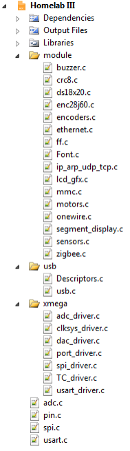 Step-by-step AVR development software installation instructions for Windows and Linux are written in the first chapter of practical examples. Although different practical examples use various parts of the library, all of them must include a static library (”.a“ file) in the project. Only header files can be included selectively. Header files which are directly related to the AVR microcontroller are in the “homelab” folder, HomeLab module specific files are in the “homelab/module” folder. Both these folders are in the compiler's root folder, and to include the files from them, less-than and greater-than signs are needed to specify the path. An example of how to include AVR pins and HomeLab motors library header files: