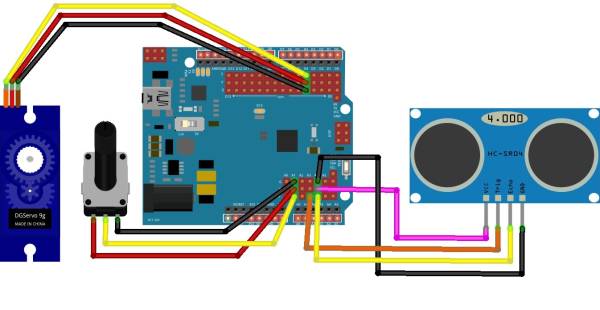 Järgnevas näites paneme kokku kaugusanduri mõõtmise ja servo liigutamise. Tulemuseks on algeline radar, mis tuvastab iga 10 kraadise liikumise järel ees oleva objekti kauguse. Mõõtetulemused saadame välja jadapordi monitorile.
