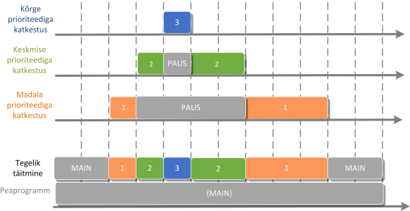 Illustratsioonilt on näha, kuidas kõrgema tasemega katkestus peatab madalama tasemega katkestuse ning madalama tasemega katkestuse programm jätkab tööd pärast kõrgema tasemega katkestuse töö lõppu.