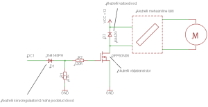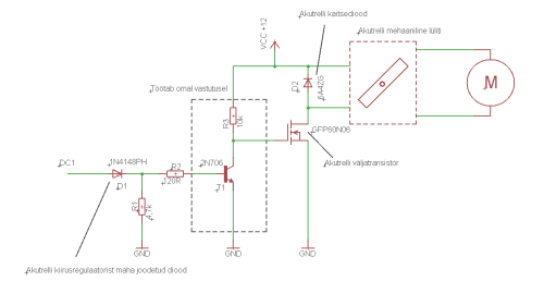 Skeemi järgi tuleb ühendada läte (S) dioodi D2 +klemmiga ja seejärel D2 +klemm mehaanilise lüliti ühe viiguga. Väljatransistori neel(D) tuleb ühendada maaga, maaga peab ühendama ka mootoriteplaadi DC0 viikude paarist alumise viigu, R1 takisti ühe elektroodi, akutrelli aku -potensiaaliga klemmi ja kui kasutusel NPN transistor, siis selle emitter elektroodi. Teistesõnadega on kõik need elektroodid/viigud omavahel ühendatud. Väljatransistori pais ühendatakse kas läbi kaitsedioodi D1 Mootoriteplaadiga või NPN transistori kollektor elektroodiga.