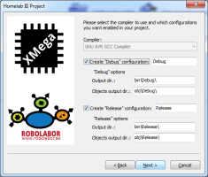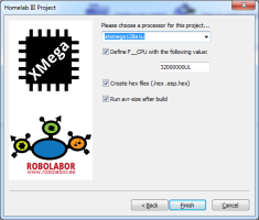 Robootika Kodulabor III näide. Peale Kodulabori versiooni valmist valida projektile nimi ning asukoht. Vältida täpitähtede kasutamist. Seejärel valida projekti kompileerimiskaust. Soovitatav jätta selleks, mis on ning järgmises aknas valida mikrokontroller ning kasutatav taktsagedus. Kui kasutatakse Robootika Kodulabori projekti, siis on kõik väärtused juba eeltäidetud ja midagi ümber pole vaja muuta.
