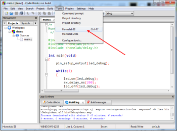 Kui projekt on loodud, ilmub vasakule projektipuusse uus projekt koos main.c failiga, kus on juba lihtne näitekood. Kompileerimine käib CodeBlocksis tööriistaribal oleva hammasratta ikooniga või klahviga F7. Kui kompileerimine õnnestub kuvatakse all Build Log aknas kasutatud programmimälu maht ning ebaõnnestumise korral veateated.