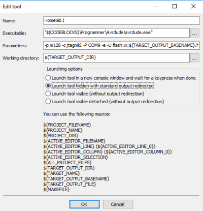 Seejärel tuleb seadistada programmaator, et oleks võimalik koodi peale laadida otse CodeBlocks keskkonnast. Selleks tuleb menüüs leida Tools → Configure tools… ning sealt vajutada Add. Avanenud aknasse kirjutada vastavalt kasutatavale kodulaborile järgmised read: