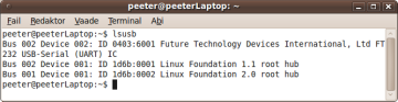 Ühendada programmaator arvutiga ning kontrollida, kas arvuti tunneb seadme ära. Terminali aknasse kirjutada käsk lsusb, mis näitab nimekirja ühendatud USB seadmetest. Programmaatori nimi on “Future Technology Devices International, Ltd FT 232 USB-Serial (UART) IC”.