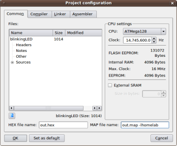 3. Seadistada KontrollerLabi projekt vastavalt Kodulabori riistvarale. Valida menüü Project → Configure Project, mispeale kuvatakse projekti seadistamise aken avatuna Common-kaardil. Määrata protsessoriks (CPU) ATmega128, taktsageduseks (clock) 14745600,0 Hz ning loodavate HEX ja MAP failide nimed. Vajutades nuppu Set as default, määrab see hetkeseadistused KontrollerLabis ka kõikide edaspidi loodavate projektide seadistusteks. Kuna sõltumata projektist jääb kodulabori riistvara samaks, siis on mõttekas määratagi sisestatud parameetrid vaikimisi parameetriteks. Samas jäävad ka KontrollerLabi poolt loodavate väljundfailide (HEX, MAP) nimed samaks. Siinkohal on kaks võimalust: igas projektis muuta HEX faili nime või panna mingi universaalsem nimi (nt out.hex), mis sobiks kõikidele projektidele. Hetkel on võetud teine variant, nii et projekti vahetamisel ei pea väljundfailide nimesid muutma.