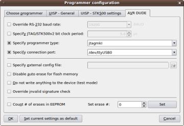 4. Määrata programmaatori seaded, valides menüü Project → Configure Programmer. Choose Programmer-kaardil valida AVRDUDE ning AVR DUDE kaardil määrata programmaatori tüübiks jtagmkI ja ühendusliideseks eelnevalt leitud port /dev/ttyUSBx (vt. programmaatori peatükki). Määrata ka siin vastavad parameetrid vaikimisi seadeteks.