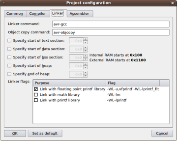 1. Avada projekti seaded menüüst Project → Configure Project ning valida Linker kaart. Märgistada Linker flags sektsioonis esimene linnuke (vaata ka juuresolevat pilti).